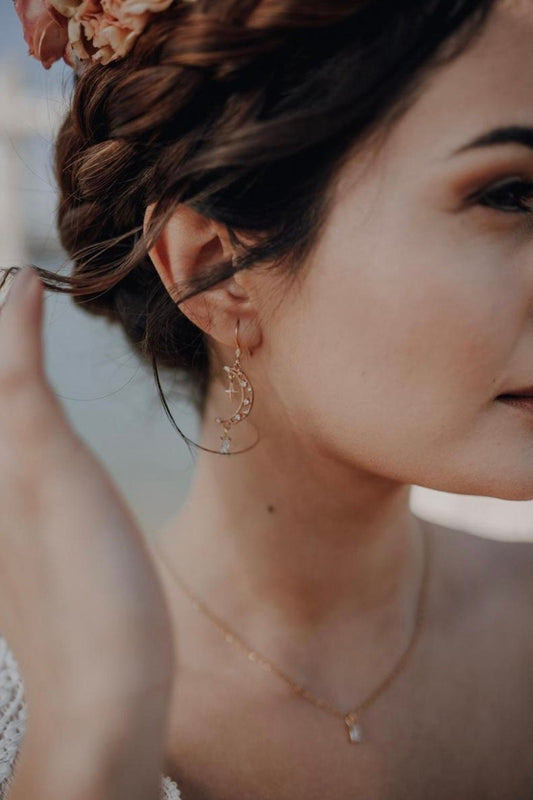 • Boho Mondohrringe – Handgefertigte Ohrringe aus Edelstahl mit Strass & vergoldetem Glasanhänger | Schmuck für Boho Bräute & Freigeister