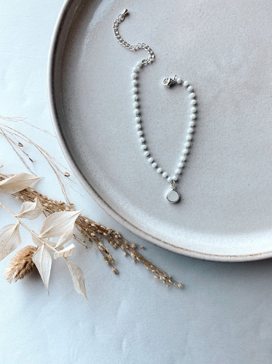 Zartes Perlenarmband in Silber mit weißem Charm – Brautschmuck aus Edelstahl & Glas | Verstellbares Armband für Hochzeit & Alltag