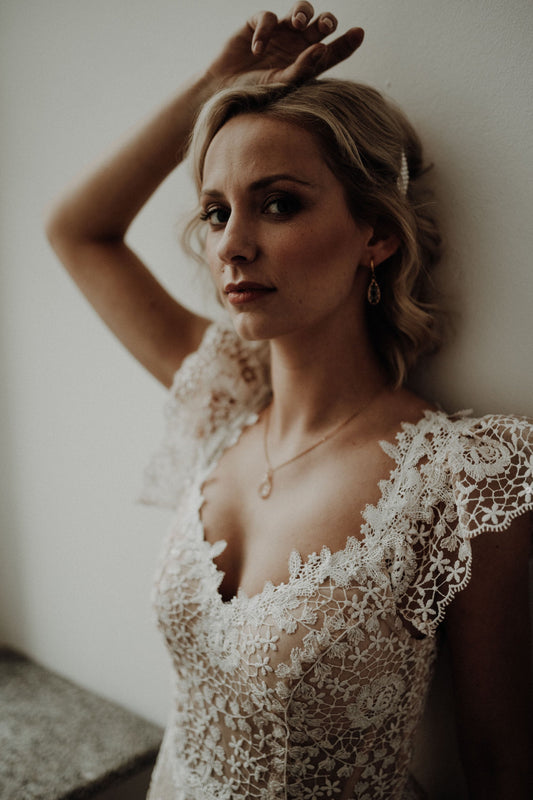 Filigranes Brautschmuckset in Roségold – Zarter Schmuck mit geschliffenem Glas in Cremeweiß