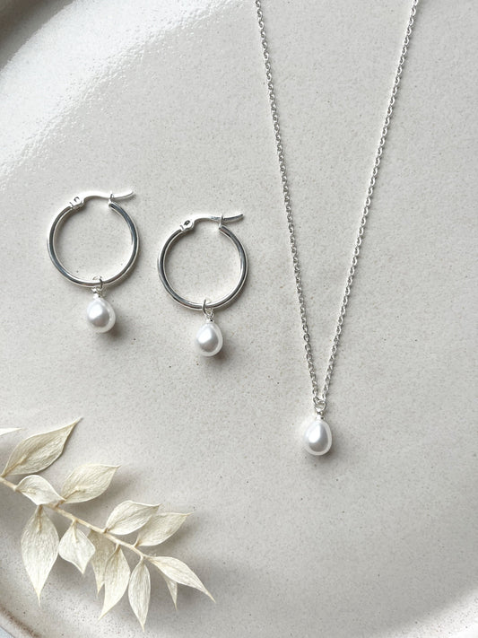 Braut Perlen Schmuckset – Edelstahl Creolen & Kette mit abnehmbaren Perlenanhängern | In Gold oder Silber, handgefertigt