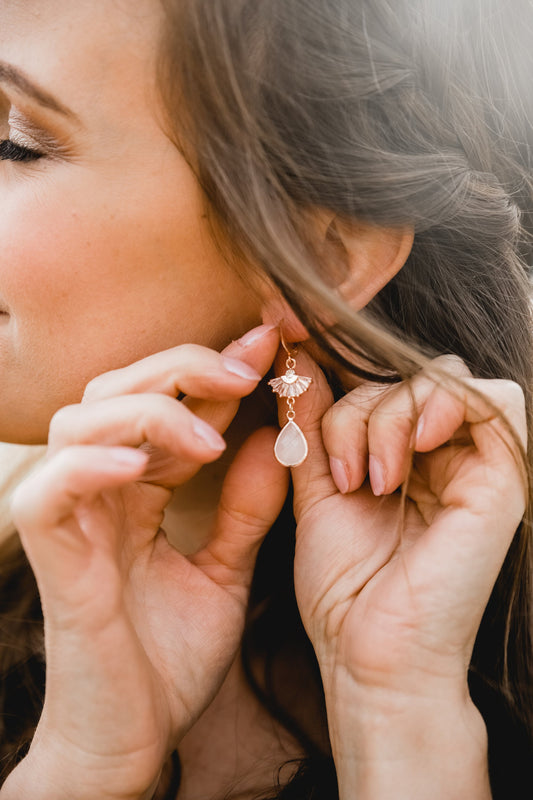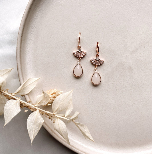Rosévergoldete Brautohrringe mit Zirkonia-Fächer & beigem Tropfenanhänger – Hochzeitsohrringe aus Edelstahl & Glas | ca. 4 cm
