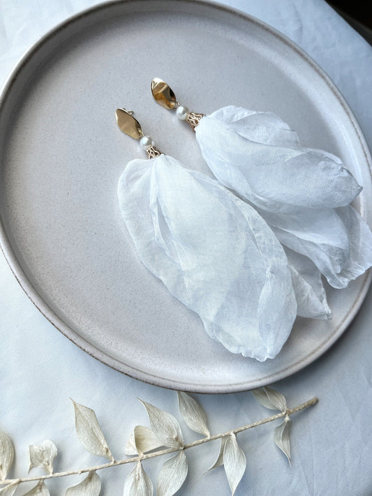 Florale Statement-Brautohrringe – Handgefertigt & auffällig in Weiß mit Perlen | Vergoldeter Stecker