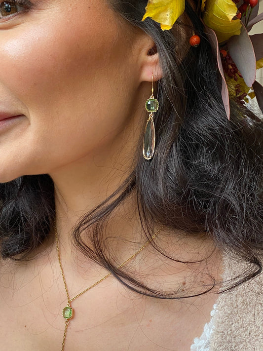 Lange Ohrringe mit grünem Stein & Tropfenanhänger – Brautschmuck & Geschenk für Weihnachten, Geburtstag oder Trauzeugin