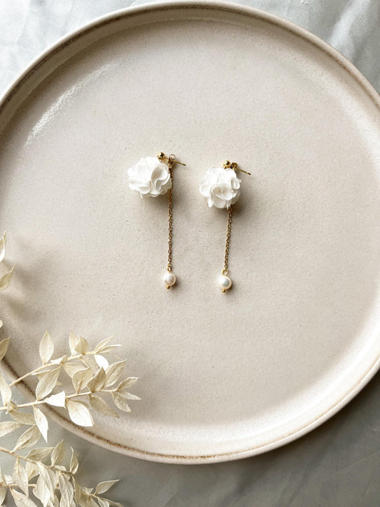 Blumige Brautohrringe mit Chiffonblüten & Süßwasserperle – Floraler Statement Brautschmuck zur Hochzeit mit Edelstahl Ohrhaken