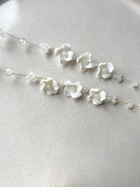 Braut Haarschmuck floral – Handgefertigter Haardraht mit Keramikblüten & Glaskristallen in Gold, Silber oder Roségold