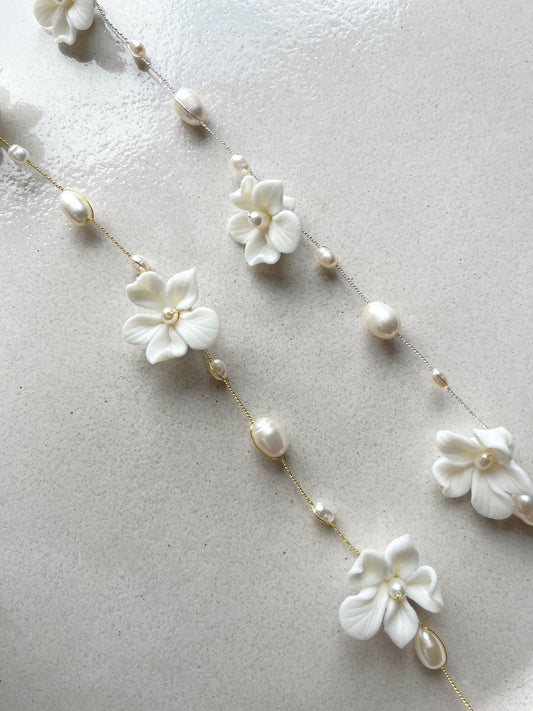 Braut Haardraht mit Keramikblüten & echten Süßwasserperlen – Floraler Haarschmuck zur Hochzeit | Handgefertigt mit vergoldetem Schmuckdraht