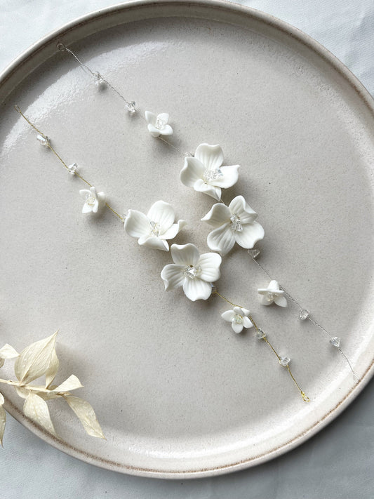 Braut Haardraht mit weißen Keramikblüten & Perlen – Floraler Haarschmuck zur Hochzeit | In Gold , Roségold oder Silber erhältlich