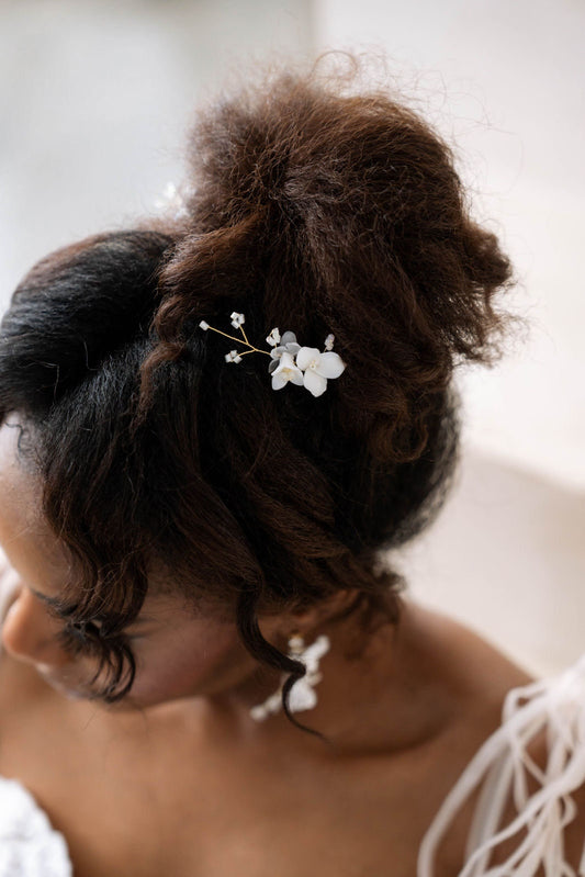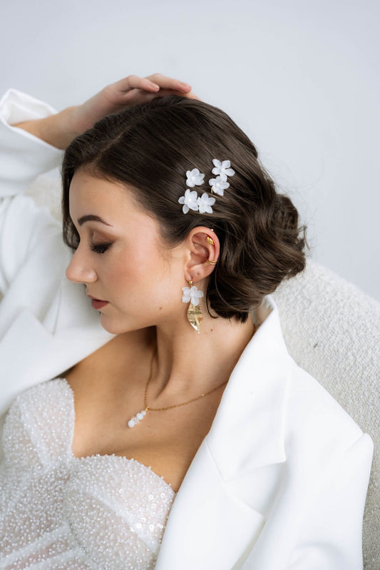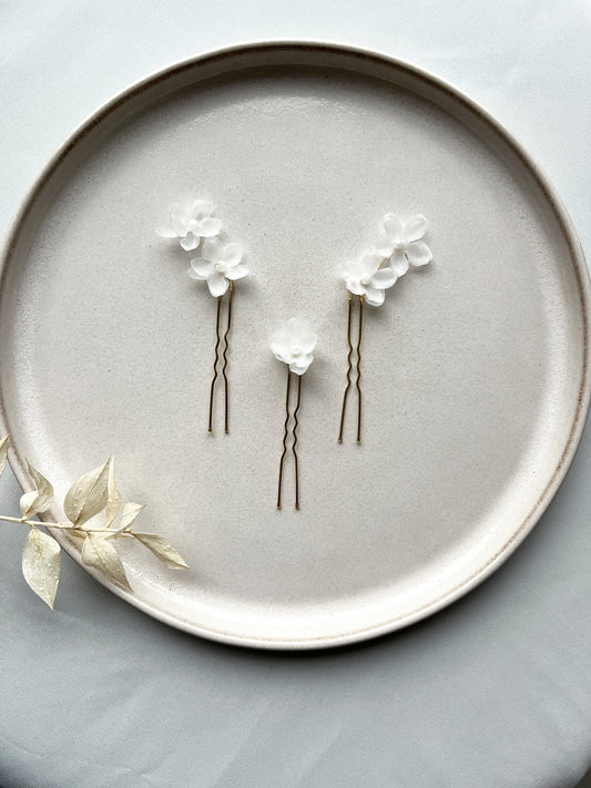 Braut Haarnadeln Haarschmuck – Elegante Haarnadeln mit weißen Keramikblüten & Perlen | Handgefertigter Brautschmuck in Gold oder Silber