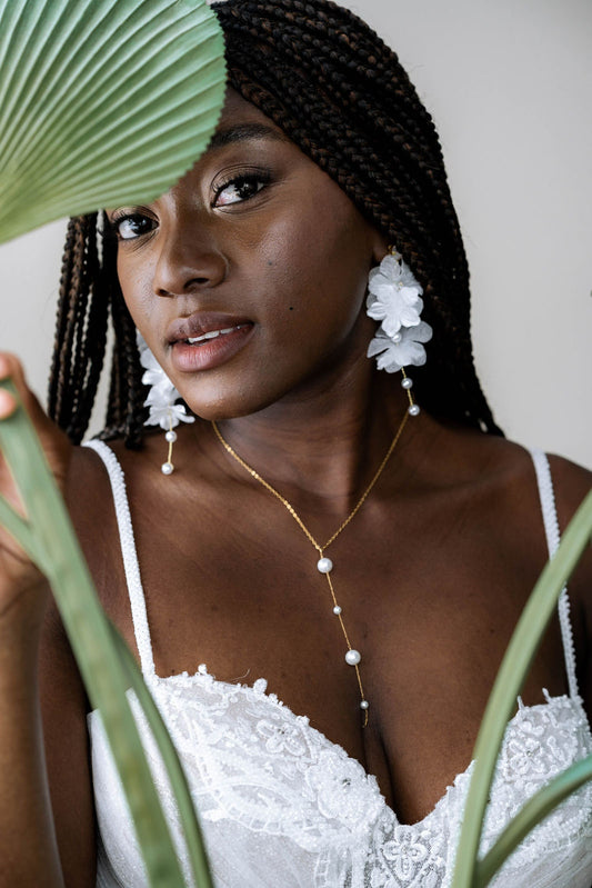 Brautkette mit Seidenblüten Y Lariat – Handgefertigte goldene Kette in Y-Form | Edelstahl Schmuck für die moderne Braut