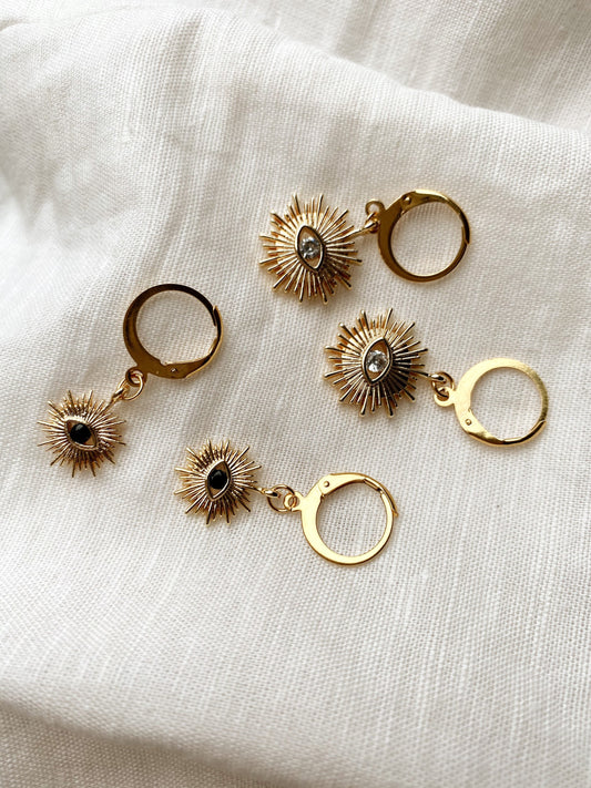 Creolen mit Auge-Anhänger & Zirkoniastein – Alltags-Ohrringe in Gold | Zwei Varianten mit klarem oder schwarzem Stein
