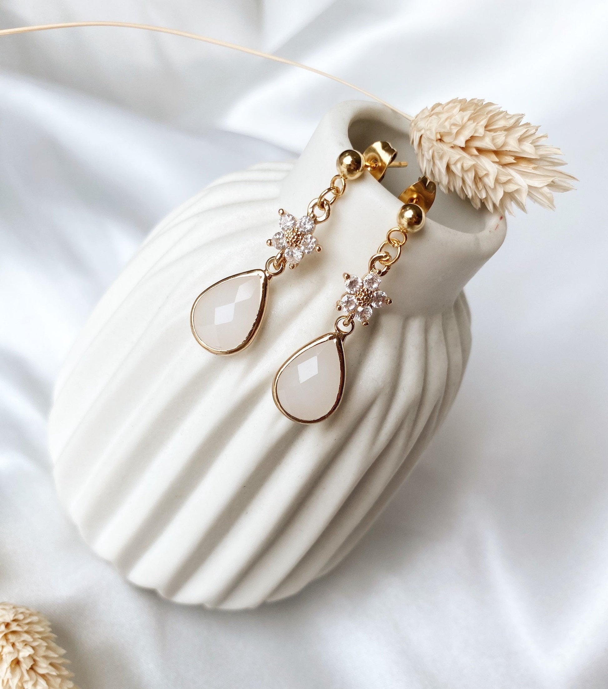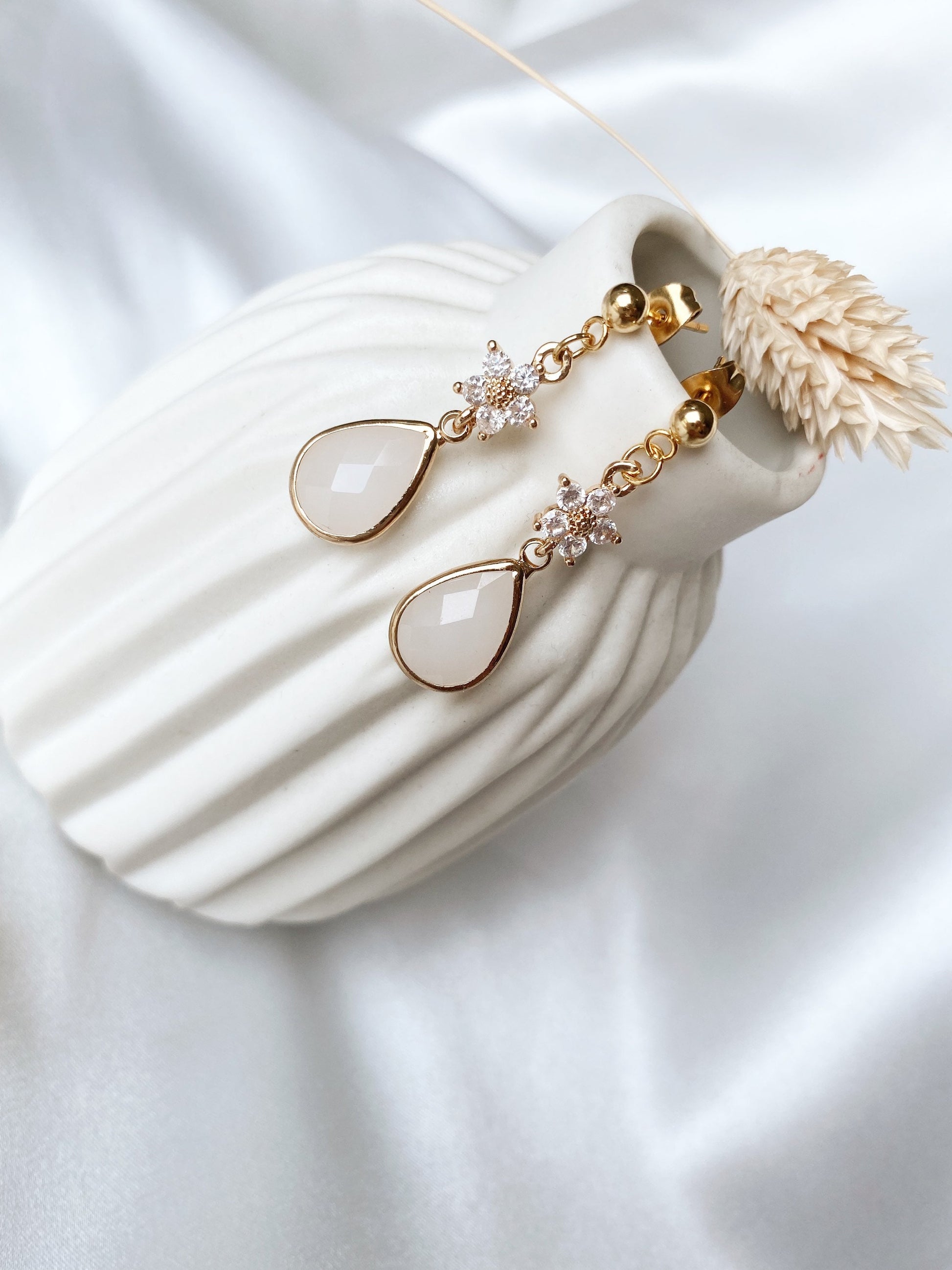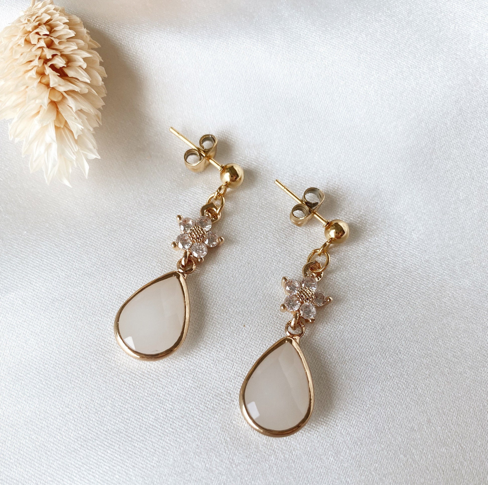 Florale Tropfenohrringe – zarte Edelstahl Ohrringe mit Zirkoniablüte und Glastropfen für Braut & Alltag