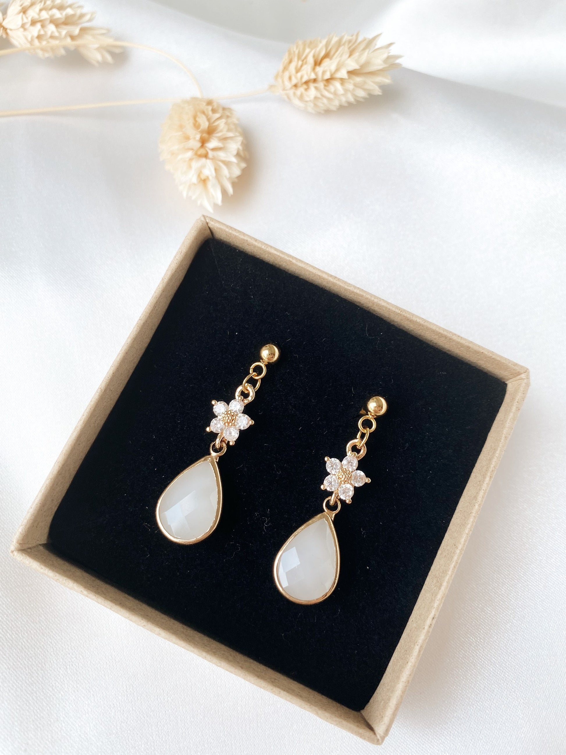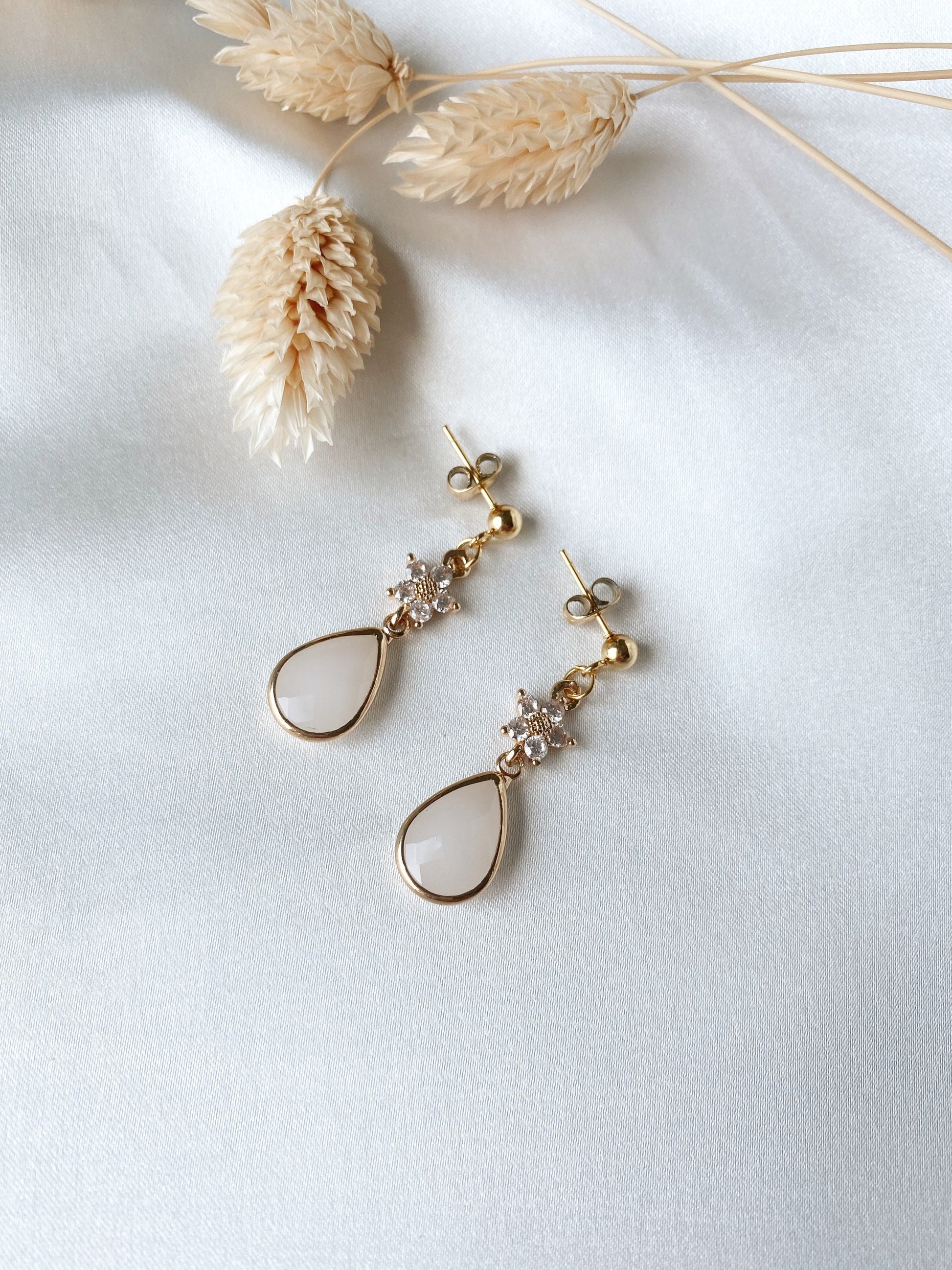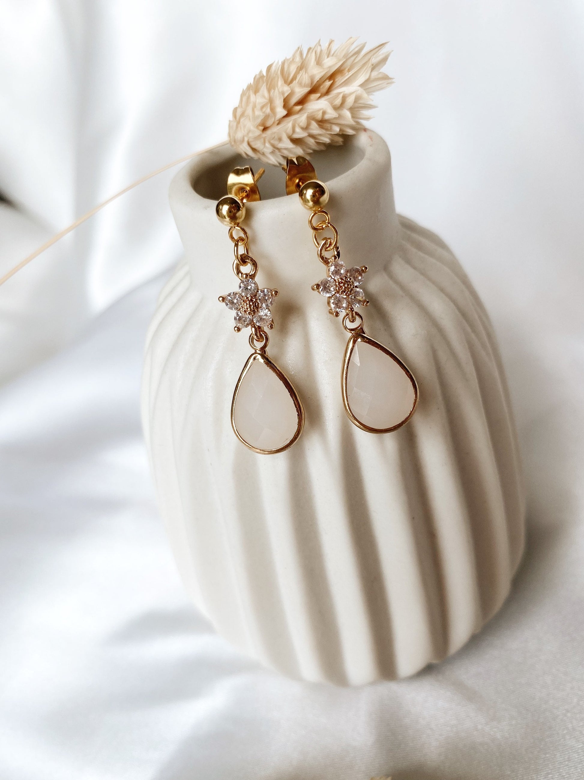 Florale Tropfenohrringe – zarte Edelstahl Ohrringe mit Zirkoniablüte und Glastropfen für Braut & Alltag