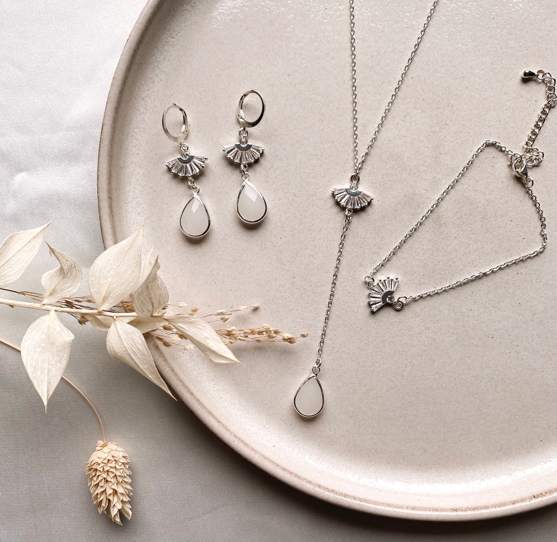 Braut Schmuckset Silber – Handgefertigtes Schmuckset mit Zirkoniafächer & Glastropfen | Edelstahl versilbert für Hochzeit & besondere Anlässe