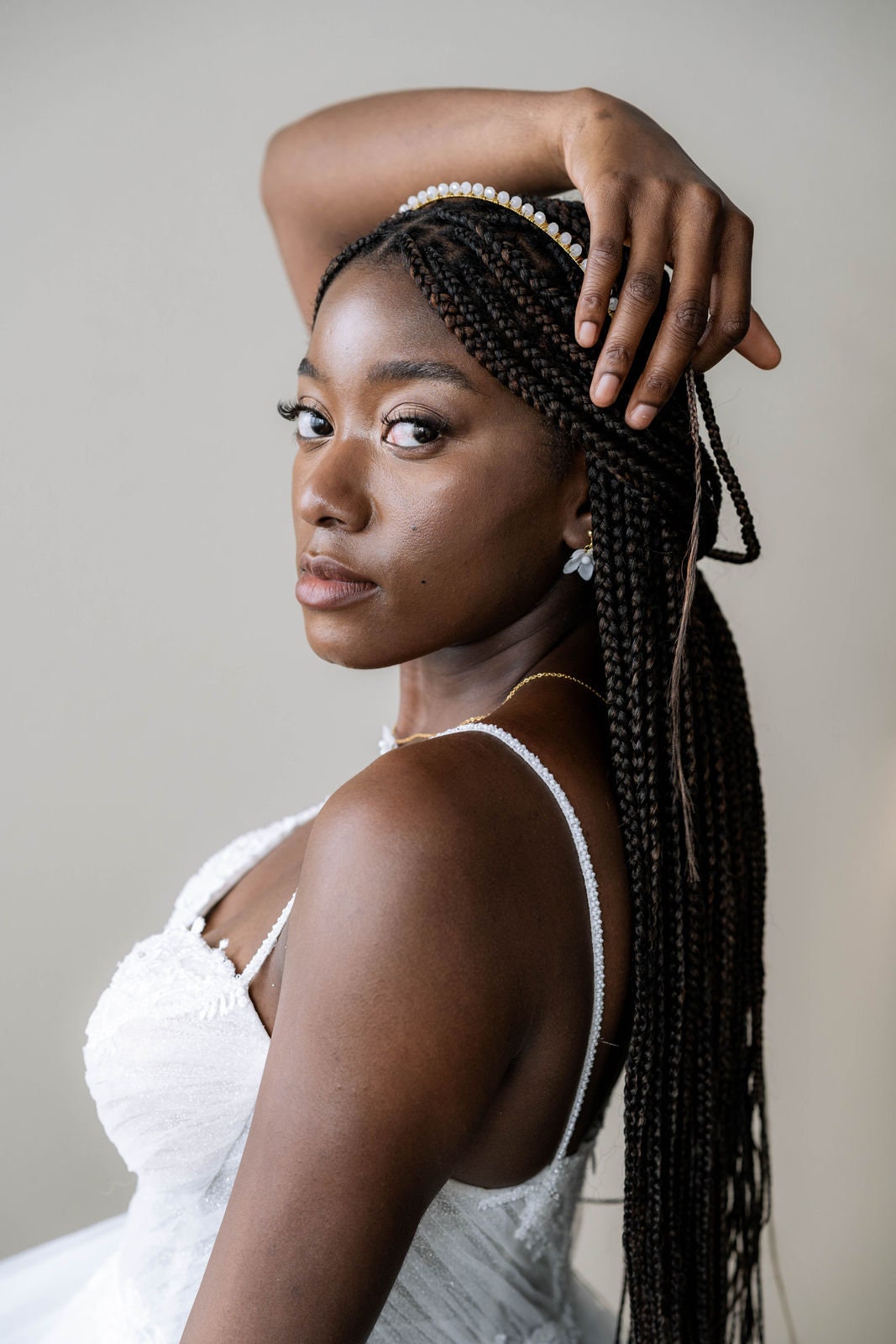Feine Seidenblüten und zarte weiße Glasperlen vereinen sich zu einem romantischen Ensemble, das deinem Brautlook eine natürliche, sanfte Ausstrahlung verleiht.