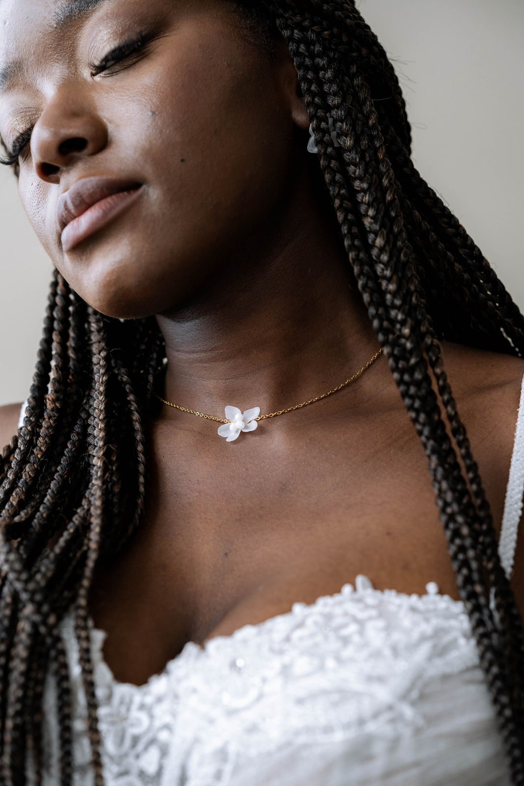 Die filigrane Edelstahlkette mit Blütenanhänger betont dein Dekolleté auf subtile Weise, während die kleinen Ohrstecker das Licht sanft reflektieren und dein Gesicht zum Strahlen bringen.