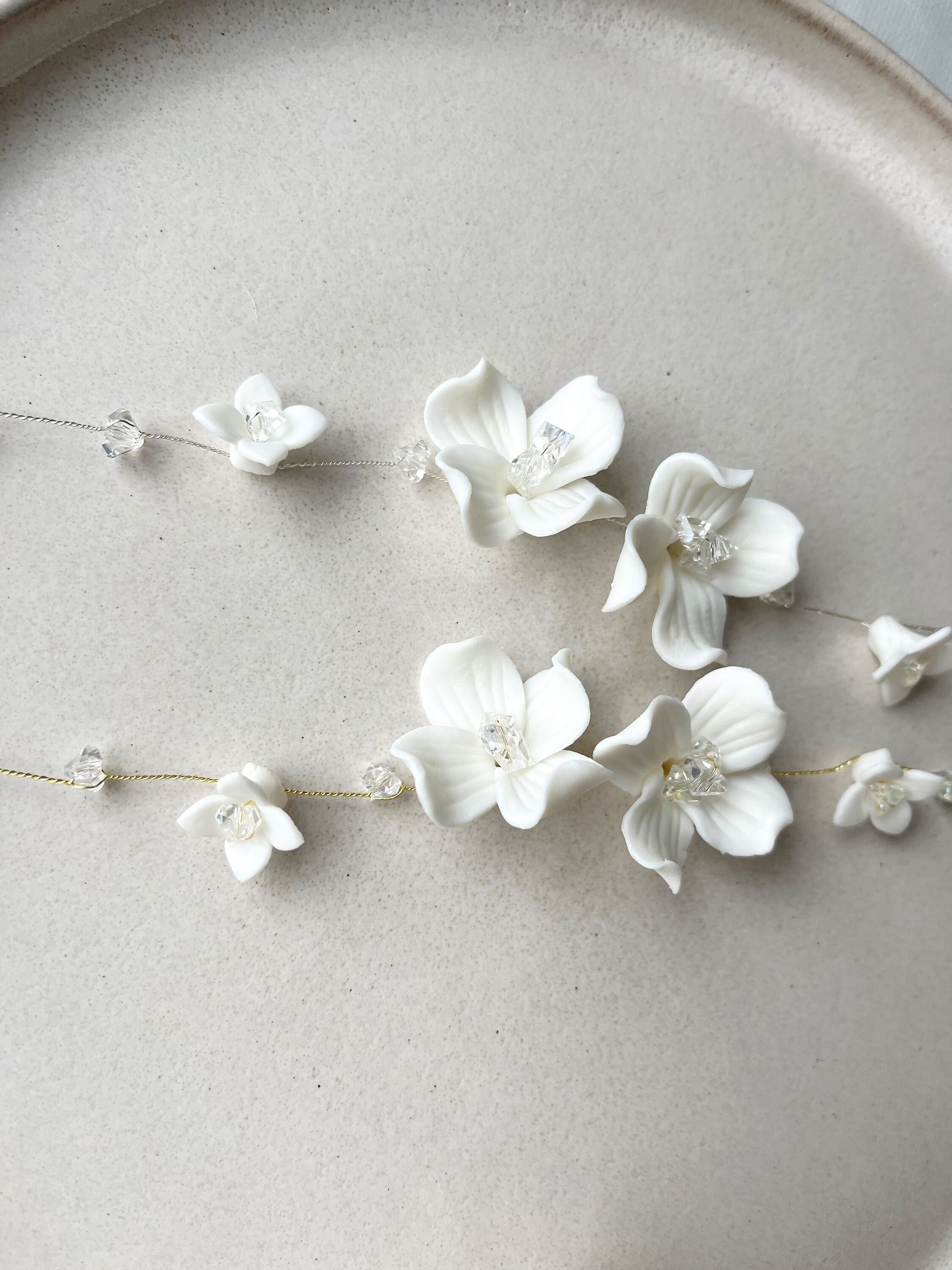 Braut Haarschmuck floral – Handgefertigter Haardraht mit Keramikblüten & Glaskristallen in Gold, Silber oder Roségold