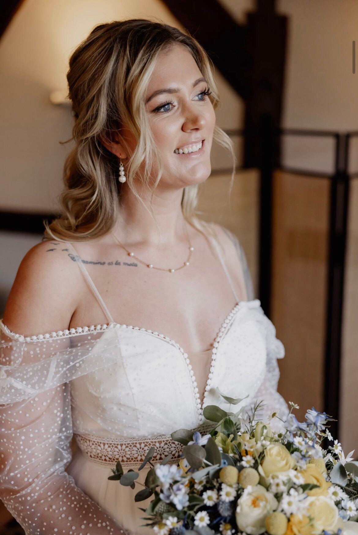 Dieses vergoldete Schmuckset, bestehend aus einer eleganten Perlenkette und filigranen Ohrhängern mit je drei echten Süßwasserperlen, verleiht deinem Look pure Eleganz – ob zur Hochzeit, zum besonderen Anlass oder als stilvolles Highlight im Alltag.