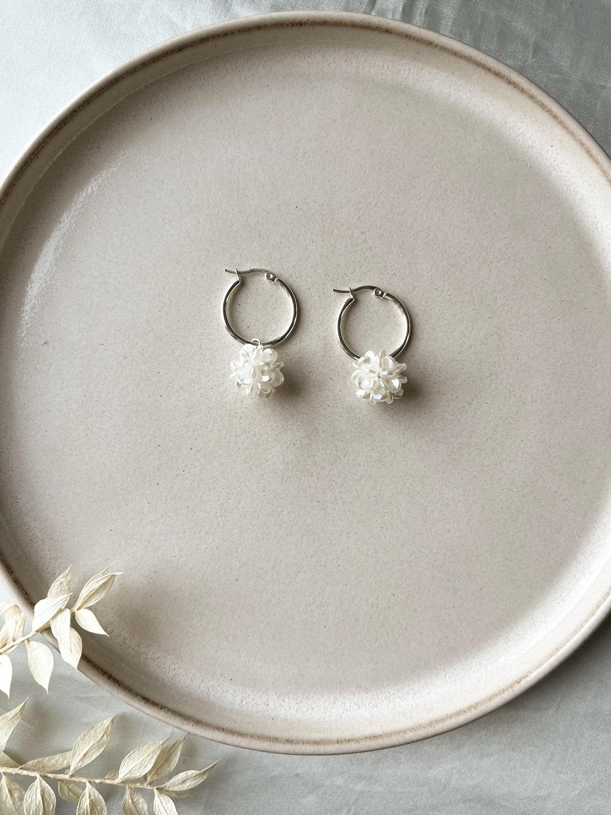 Unsere handgefertigten Braut-Creolen sind aus hochwertigem Edelstahl gefertigt und in Gold oder Silber erhältlich. Der blütenartige Anhänger aus Perlen setzt ein verspieltes, romantisches Statement – ideal für moderne Bräute, die zarte Eleganz lieben.