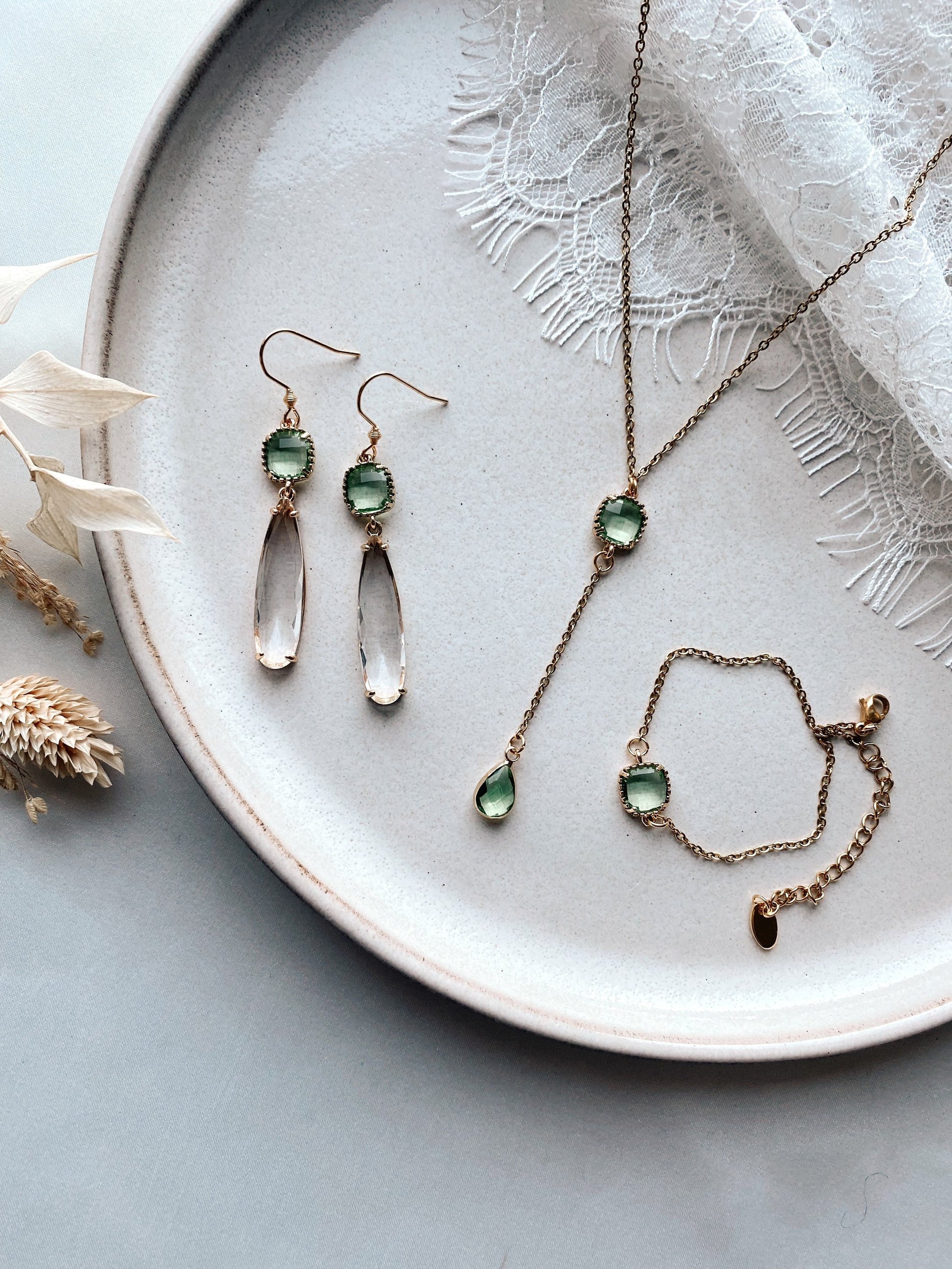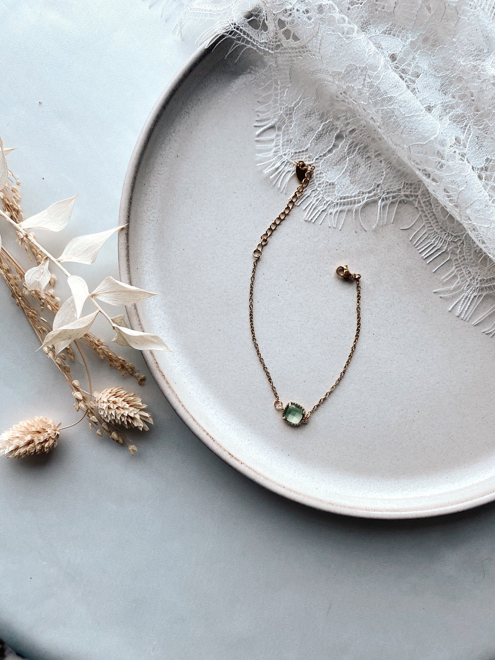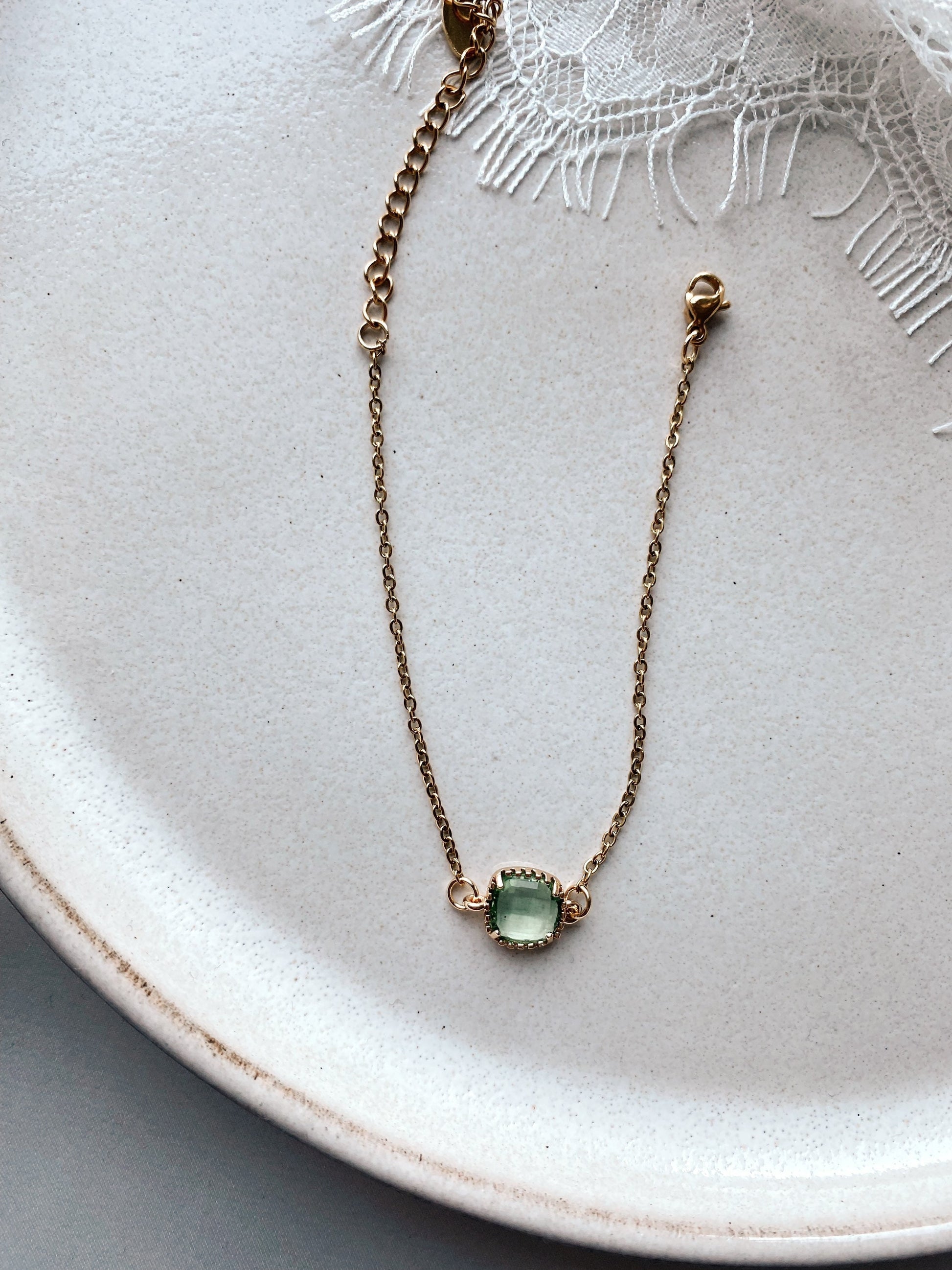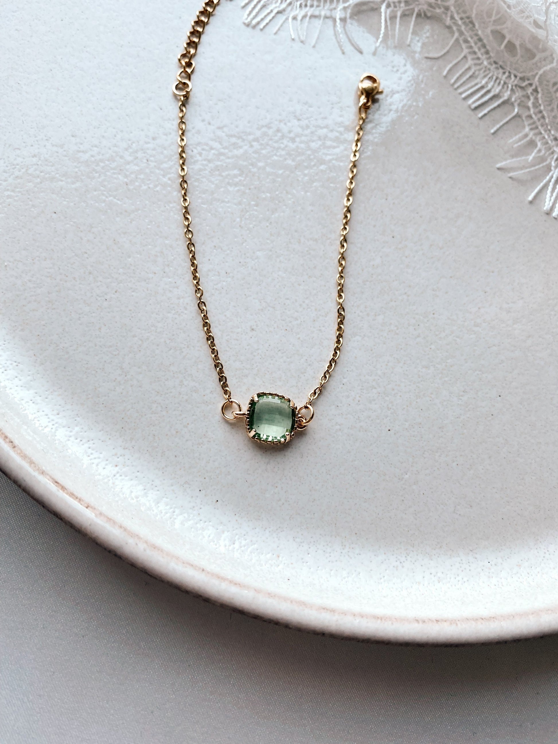Goldenes Armband mit grünfarbenem Stein – Handgefertigtes Edelstahl Armband mit Glasstein | Zarter Schmuck für Braut & Alltag
