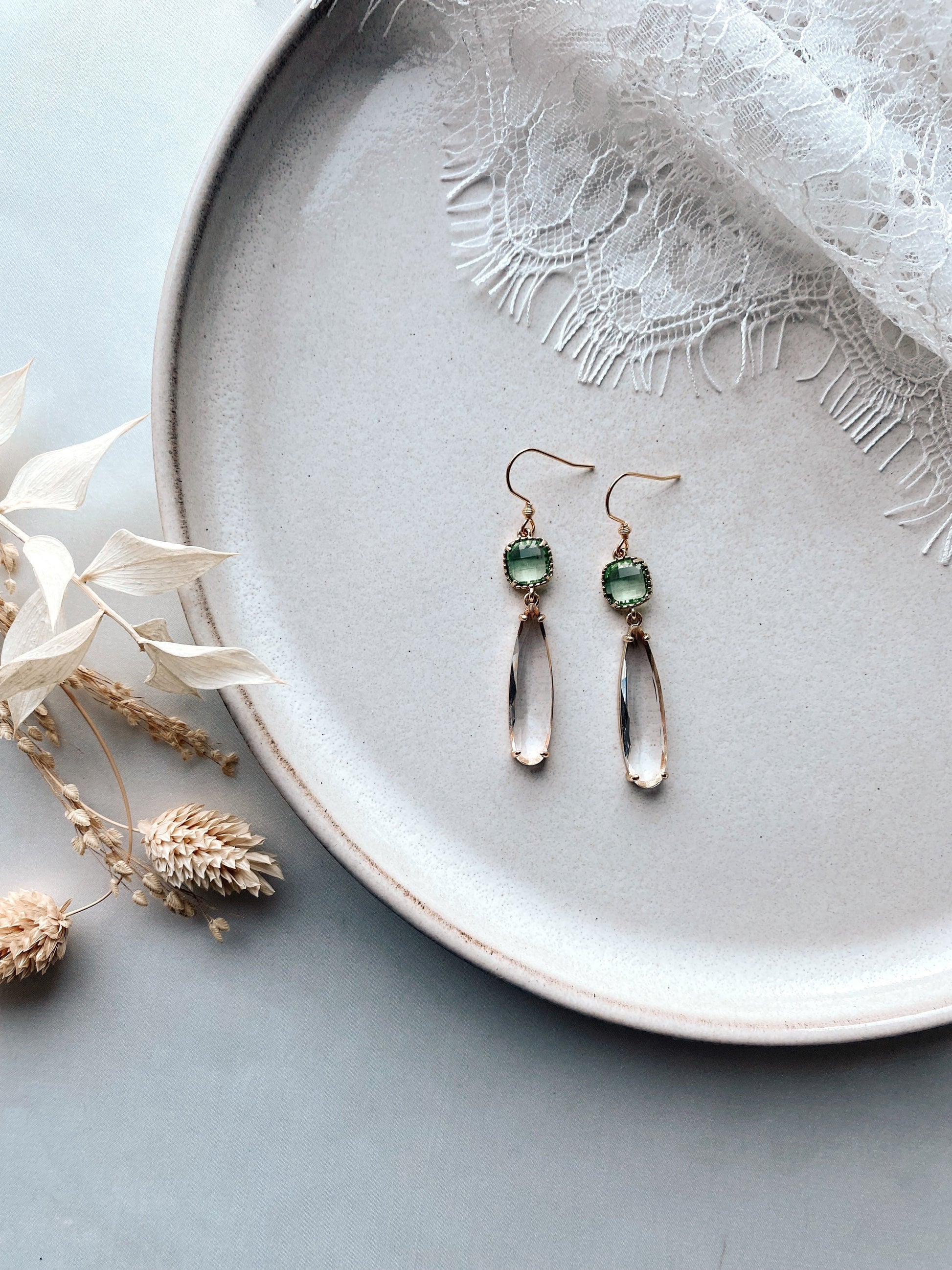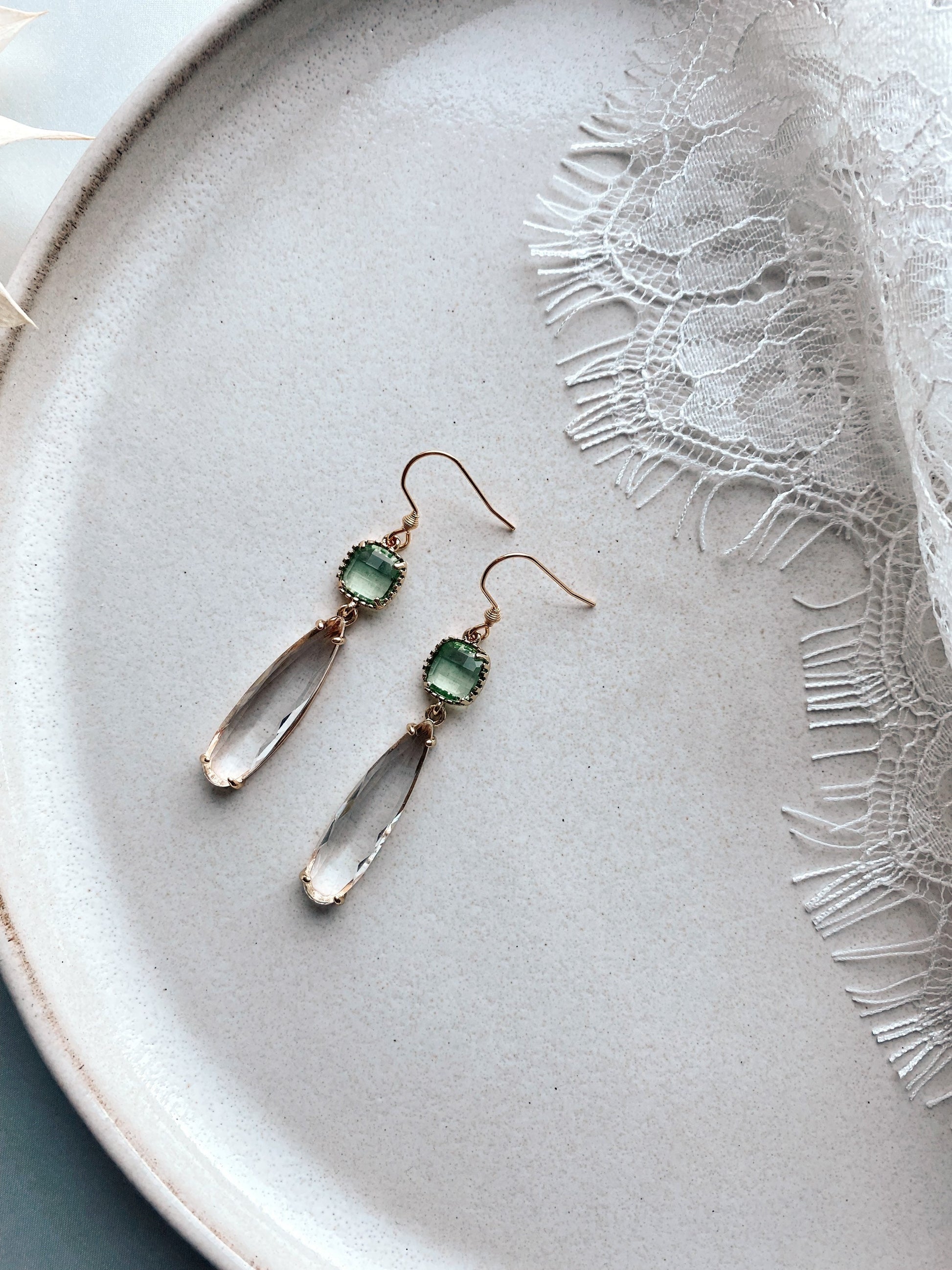Der fein geschliffene Glasstein schimmert in einem sanften Grünton, der an Morgentau erinnert, und verleiht deinem Look einen dezenten, aber wirkungsvollen Farbakzent.