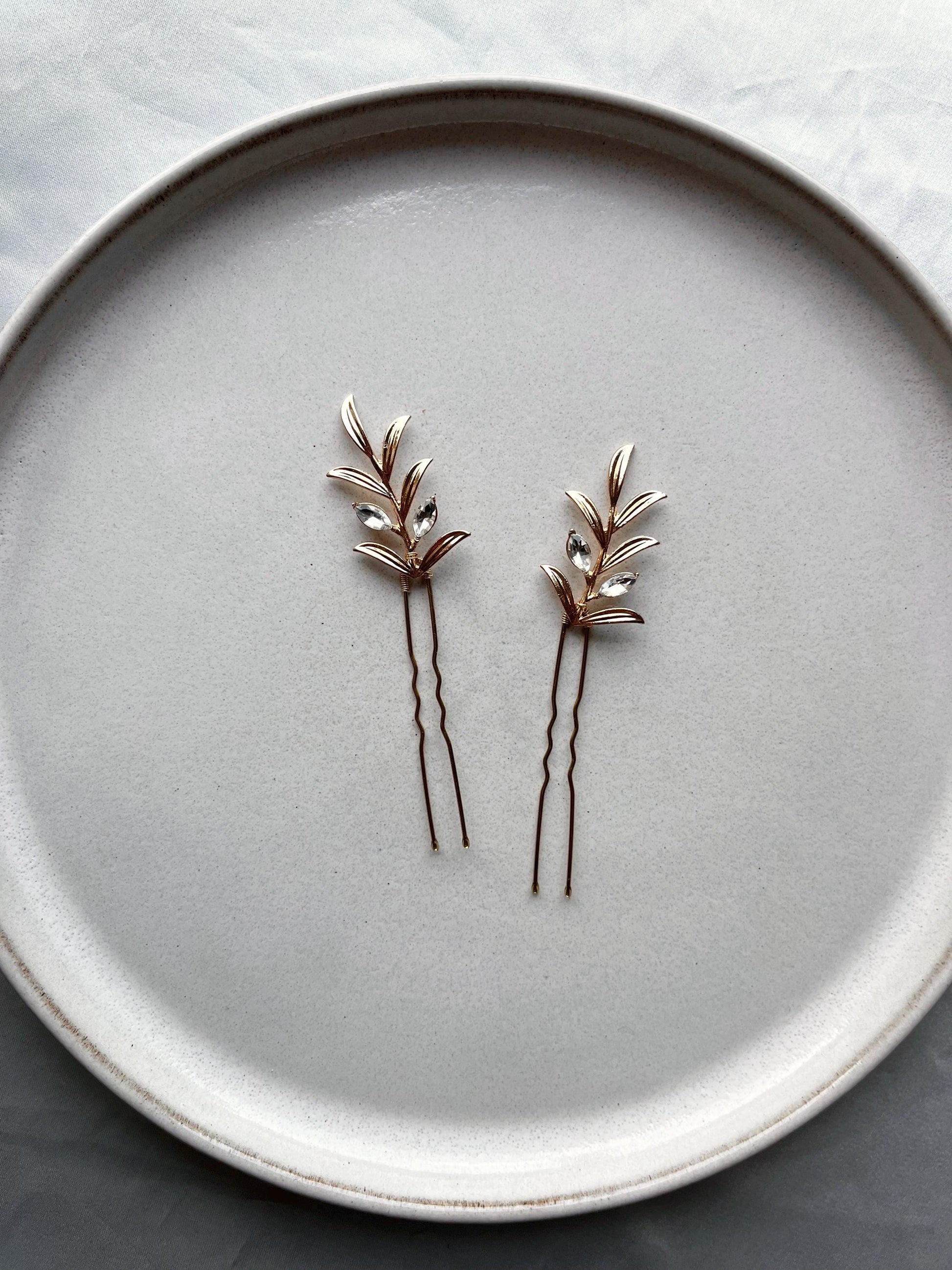 Die feinen Blätter in Gold wirken wie kleine, schimmernde Zweige – perfekt, um deine Hochzeitsfrisur mit einem natürlichen, aber luxuriösen Akzent zu vollenden. Ob in einer lockeren Hochsteckfrisur, einem romantischen Zopf oder halb-offenen Haaren – diese Haarnadeln lassen sich vielseitig kombinieren und passen zu jedem Brautlook.