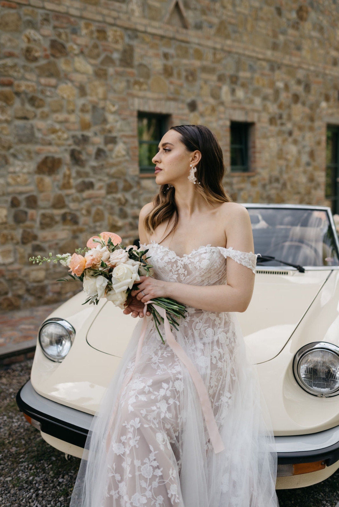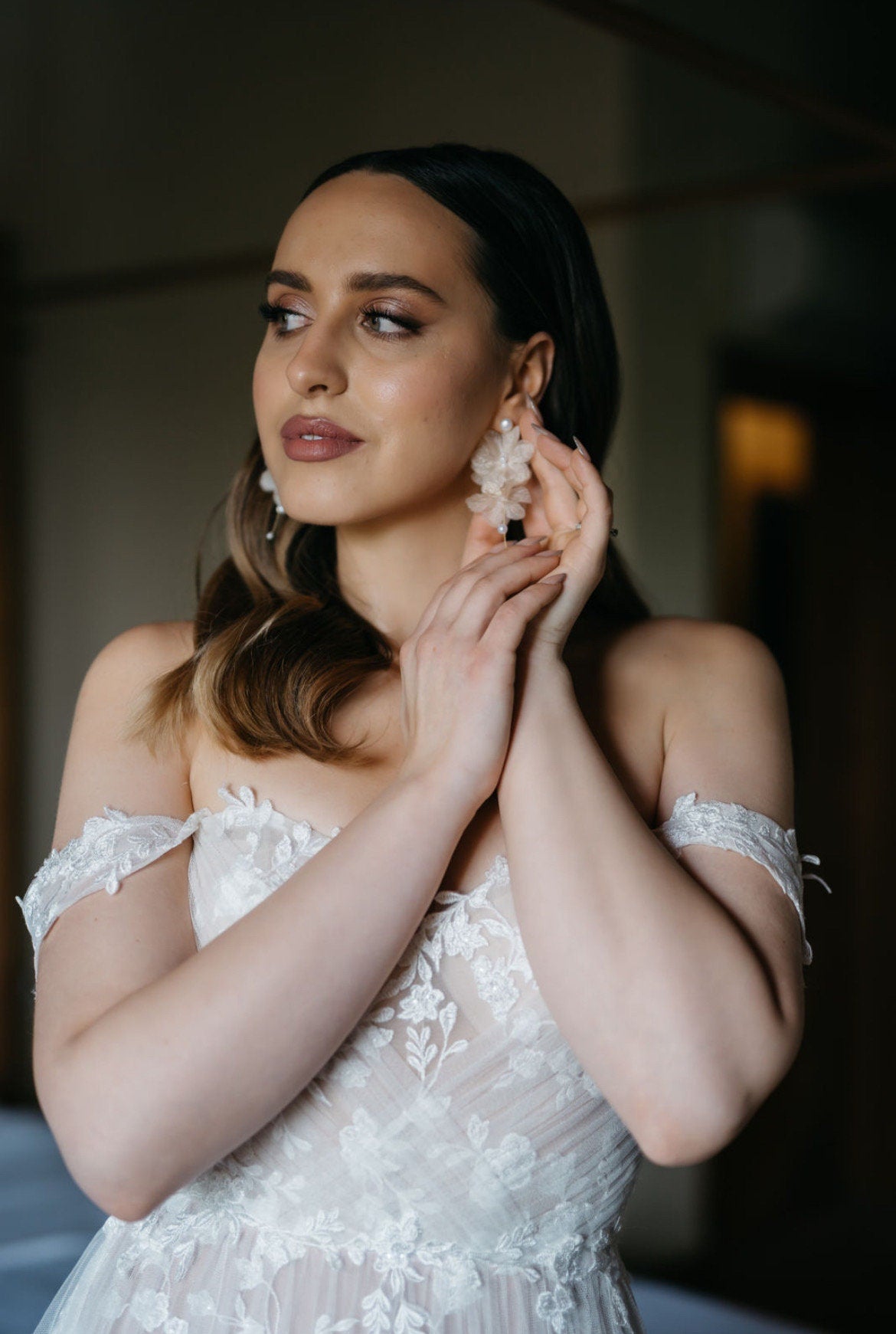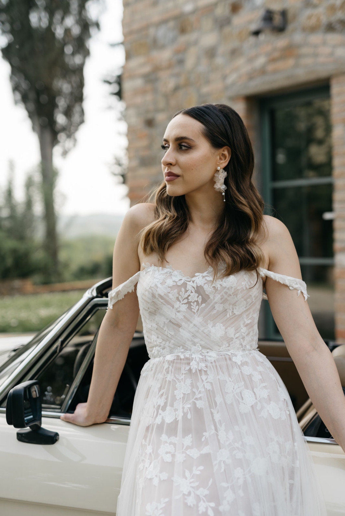 Mit ihren liebevoll von Hand gearbeiteten Details passen diese Ohrringe perfekt zu modernen, femininen Bräuten, die sich einen Hauch Natürlichkeit und Poesie wünschen.