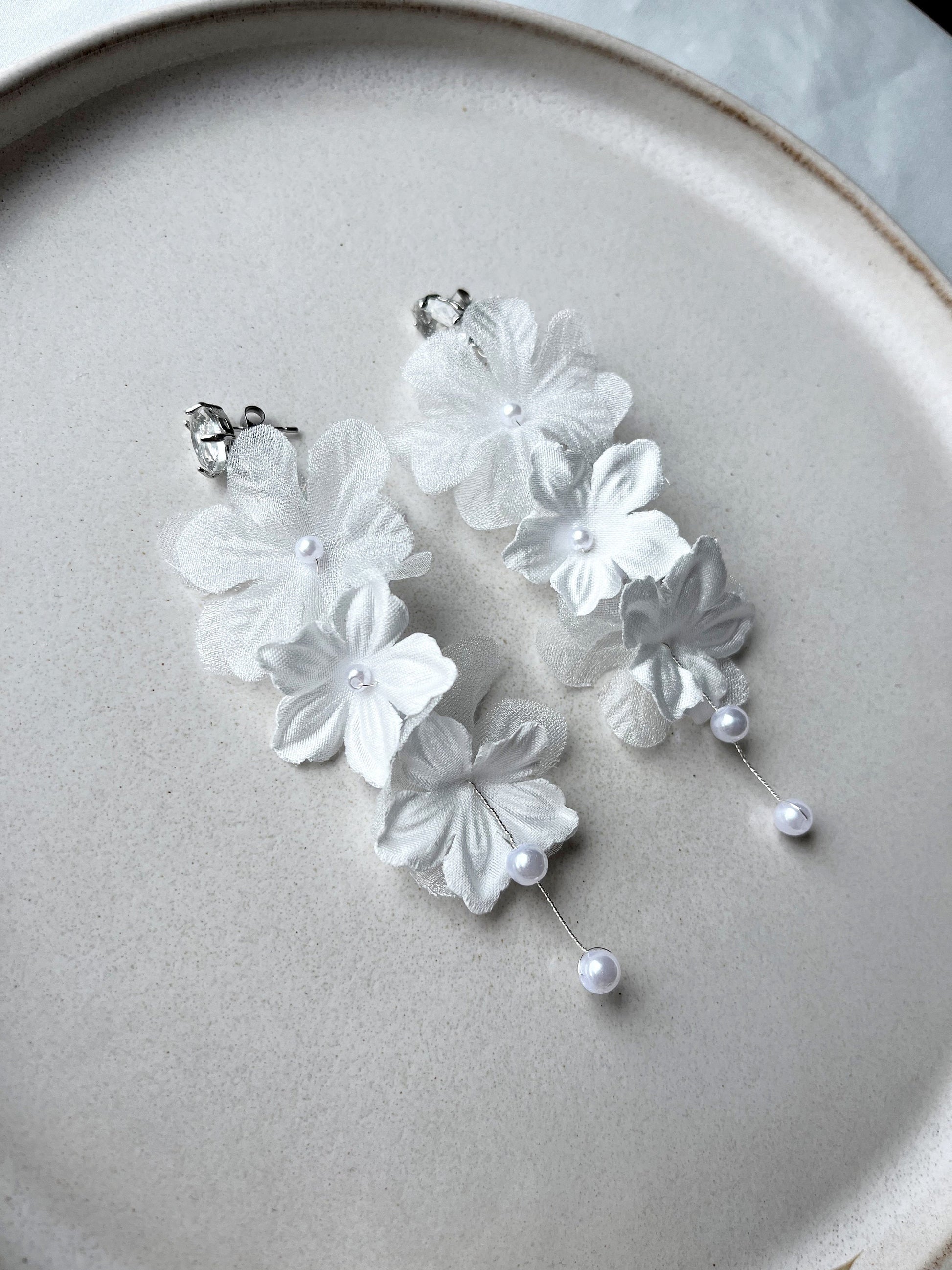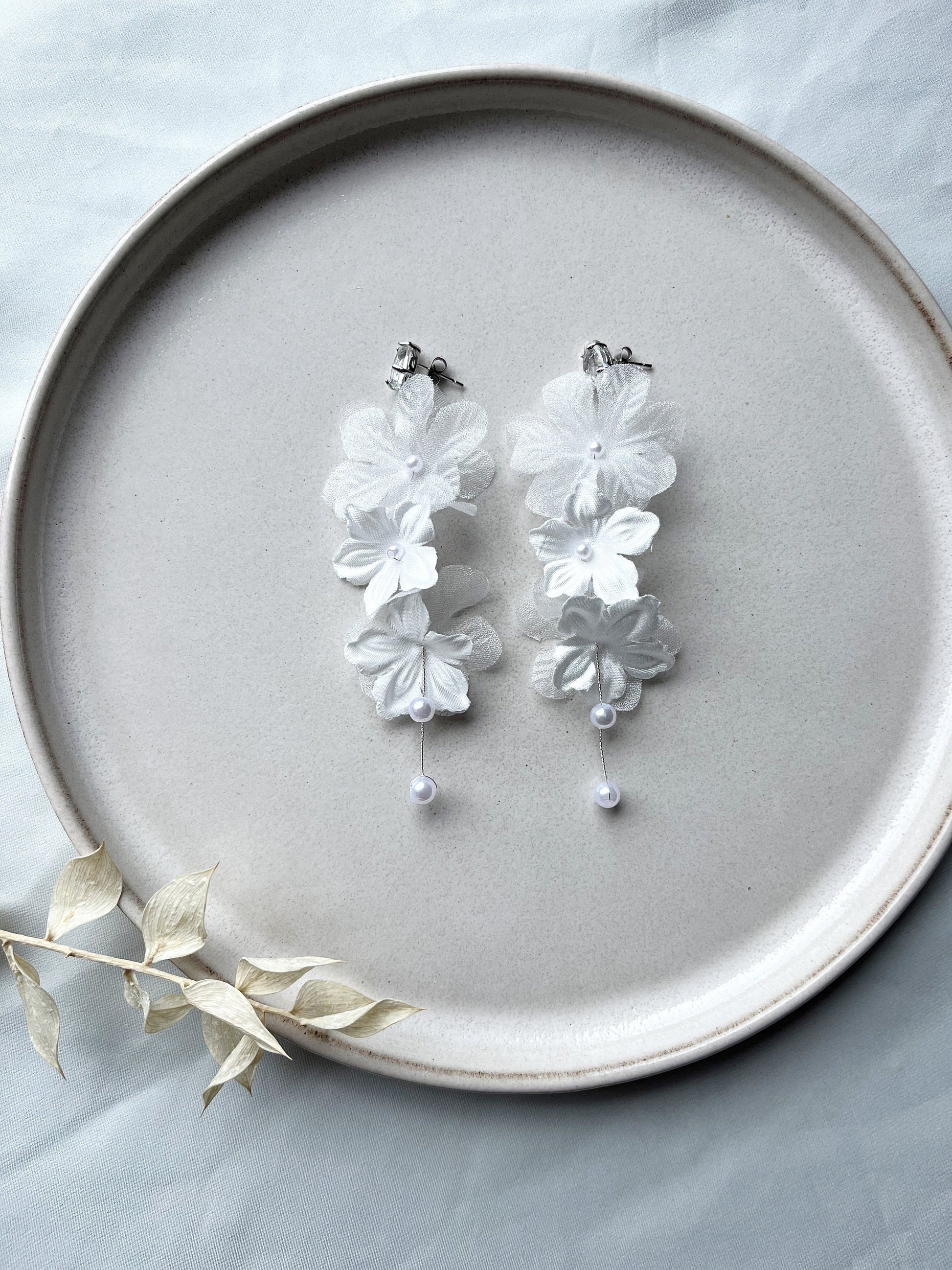 Braut Ohrringe mit weißen Blüten – Handgefertigte Statement-Ohrringe mit Seidenblüten & Perlen | Edelstahl Ohrstecker für Hochzeiten