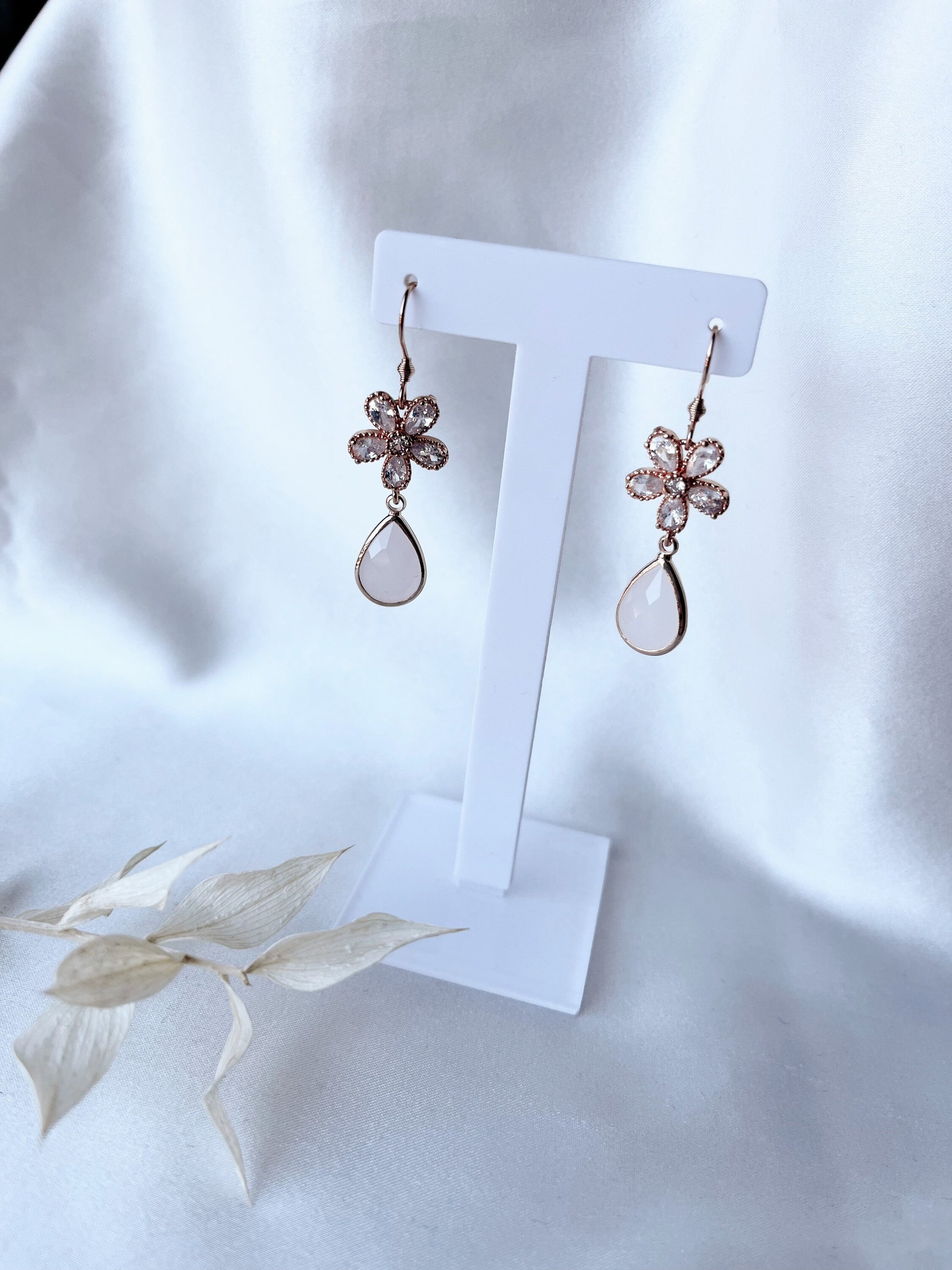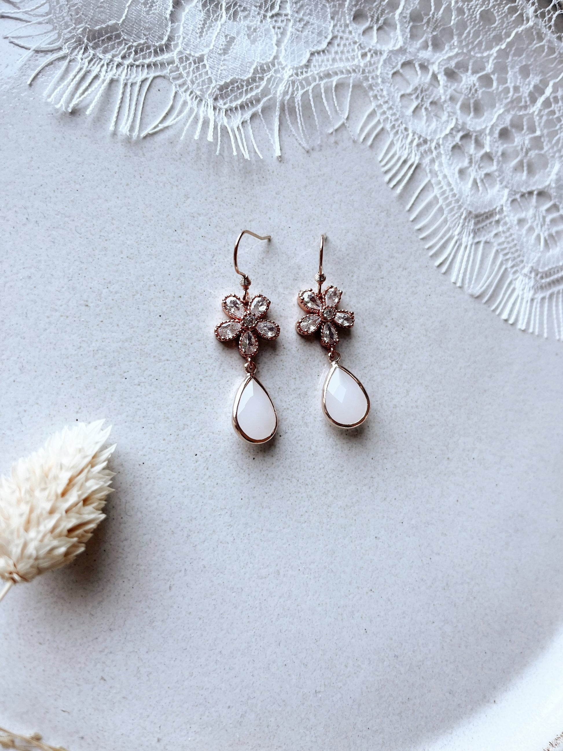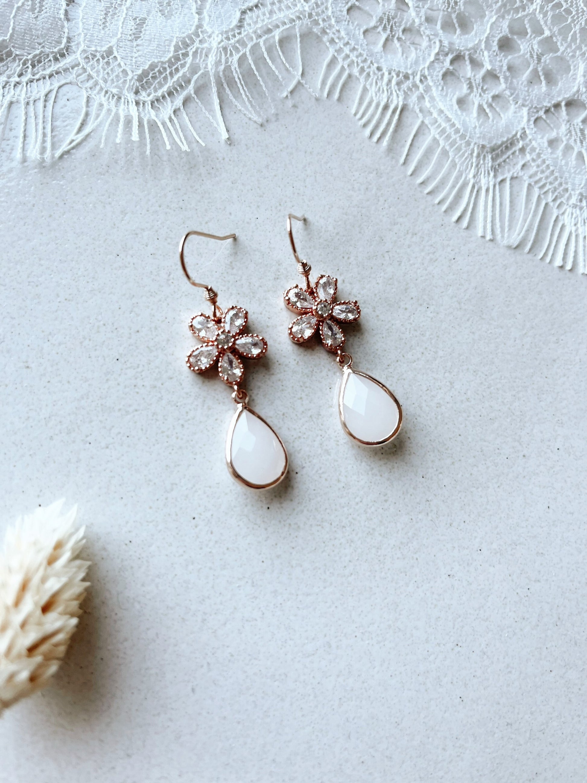 Blumiger Ohrring in Roségold oder Gold Brautschmuck – Handgefertigte Ohrringe mit Zirkoniablüten & Glastropfen | Edelstahl rosévergoldet
