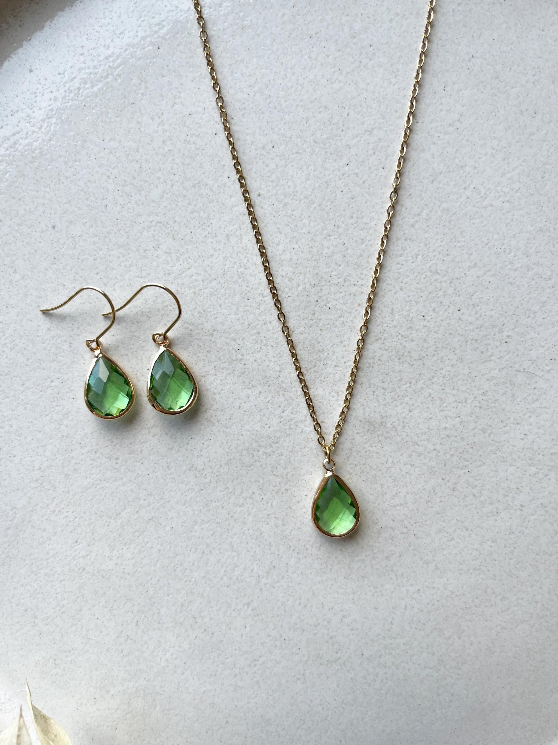 Schmuckset mit grünen Tropfenanhängern – Kette & Ohrringe aus vergoldetem Edelstahl | Handgefertigt