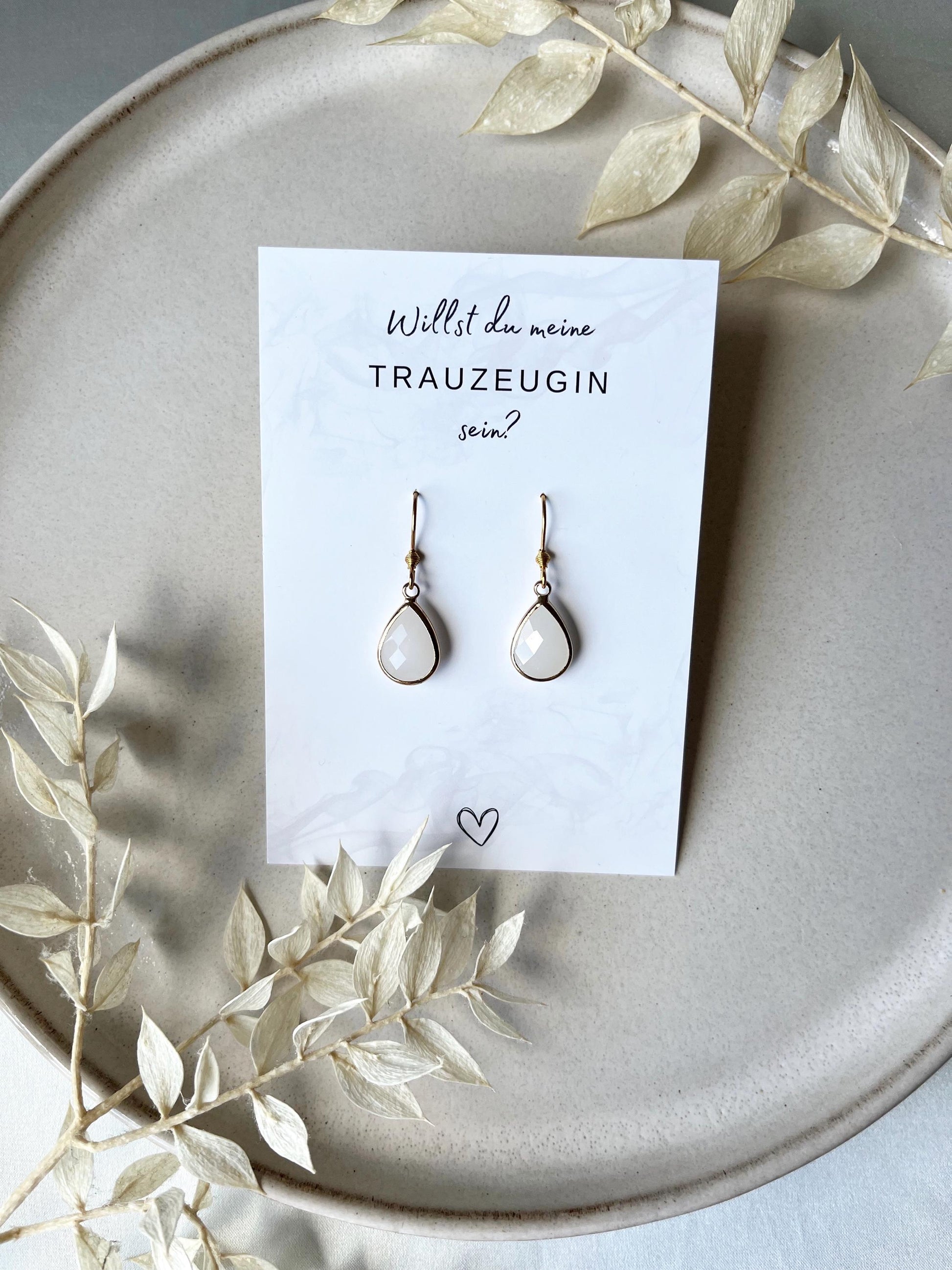 Geschenkkarte "Willst du meine Trauzeugin sein?" – Schmuckgeschenk mit filigranen Tropfenohrringen in Gold, Silber oder Roségold